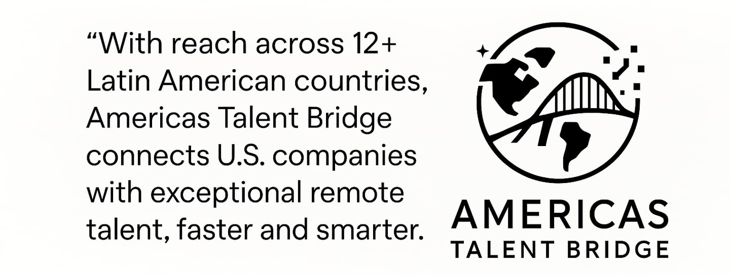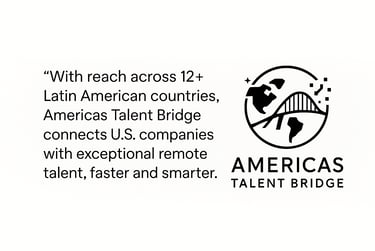 Americas Talent Bridge LLC is a premier recruitment firm specializing in connecting U.S. businesses with elite, bilingual professionals across Latin America. Founded in 2025, ATB eliminates the friction of global hiring removing legal hurdles, overhead, and time-zone misalignments. By combining AI-driven precision with deep human vetting, ATB delivers curated shortlists for tech, sales, and operations in as little as 10 days. More than a recruiter, ATB is a strategic architect that builds high-impact teams by design, bridging the gap between U.S. opportunity and LatAm brilliance.